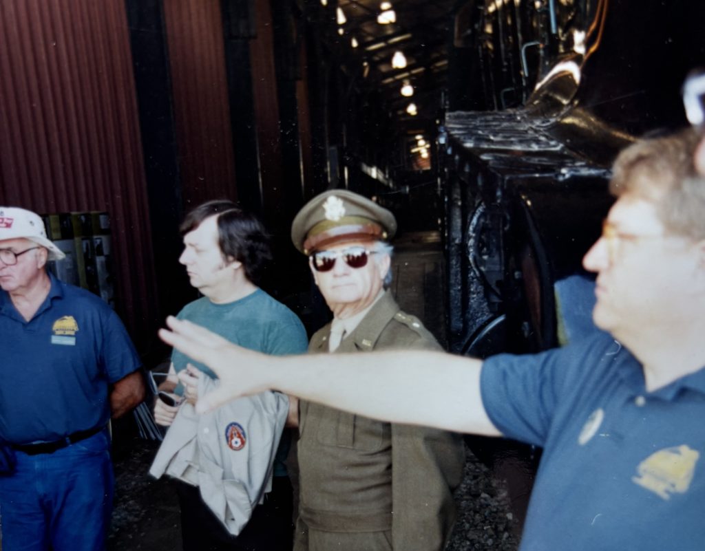 Bob was perfect for the role. He wore a general’s uniform as if it had been earned. His physical appearance and stature was performed impeccably. He is at the center of the picture. The big staff member with his arm extended was me and I’m instructing the docent at the far left of the picture to hold up the next group. In the background is the silhouette of the actual Eisenhower train exhibit.